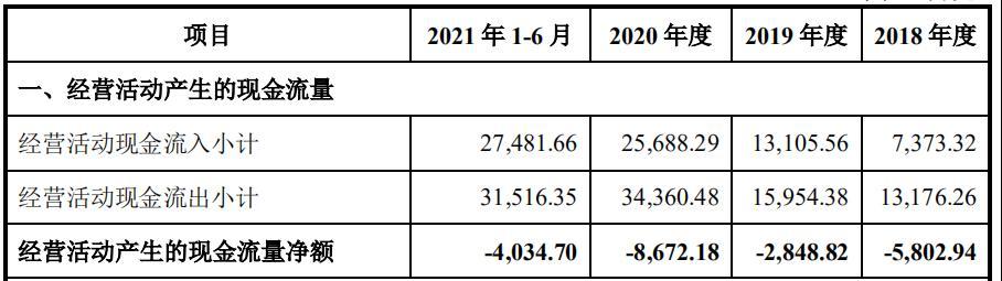 值得关注的是,报告期内,该公司经营活动产生的现金流量净额也持续为负,分别为-5802.94万元、-2848.82万元、-8672.18万元及-4034.70万元。