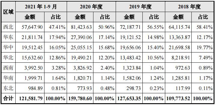雨中情创始于西北地区,生产研发基地主要在陕西西安、陕西咸阳及甘肃兰州等西北区域,因此公司营业收入半数均来自于西北地区。报告期内,雨中情实现营业收入分别为10.98亿元、12.77亿元、15.98亿元和12.16亿元,其中西北地区营业收入分别为6.41亿元、7.22亿元、8.14亿元以及5.76亿元,占营业收入的比重分别为58.41%、56.55%、50.96%以及47.41%,占比呈现下降的趋势。