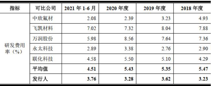 报告期内,兴欣新材的研发费用率为3.23%、3.62%、3.28%以及3.76%,而同行研发费用率均值为5.47%、5.35%、5.43%以及4.51%,显示出兴欣新材的研发费用率低于同业公司均值。