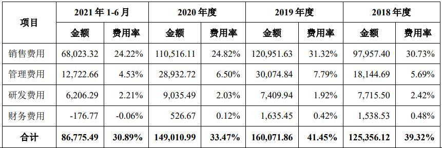 其中,广告费支出规模及占比较多,各期广告费分别为3.45亿元、4.45亿元、3.96亿元和1.93亿元,占各期销售费用比例分别为35.18%、36.81%、35.84%和28.36%。