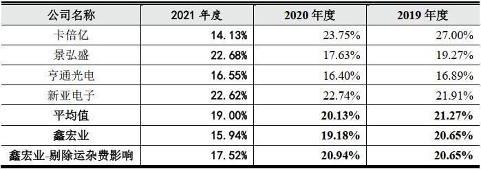 除此之外,鑫宏业的综合毛利率还低于同行均值。报告期内,鑫宏业的综合毛利率分别为20.65%、19.18&以及15.94%。剔除运杂费的影响后,其综合毛利率分别为20.65%、20.94%以及17.52%。而同期同业综合毛利率的均值分别为21.27%、20.13%以及19.00%。除2020年剔除运杂费影响的综合毛利率略高于同行均值外,其余报告期,鑫宏业的综合毛利率水平均达不到行业均值。
