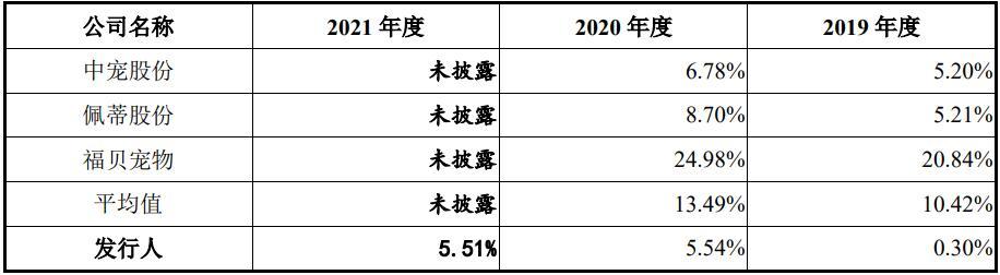 而乖宝宠物各期净利率分别为0.30%、5.54%、5.51%,远低于可比公司行业均值,也主要由产品结构差异及销售费用投入差异导致。
