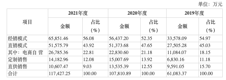阿宽食品2019年至2021年主营业务收入按销售模式构成情况