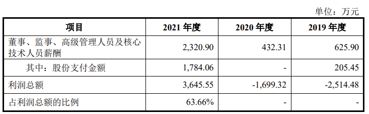 不仅如此,招股书显示,2019年和2020年公司董事、监事以及高级管理人员及核心技术人员的薪酬分别为625.9万元和432.31万元,而2021年突增为2320.9万元,较上年同期增长436.86%,占利润总额的比例高达63.66%。