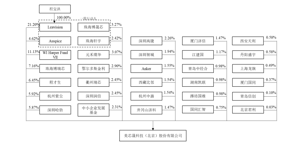 从股权结构来看,本次IPO前,Leavision直接持股比例为21.2%;Auspice直接持股比例为4.62%的股份;珠海博晟芯直接持股比例为3.27%;珠海轩宇直接持股比例为2.42%。Leavision通过直接持有和一致行动协议约定,控制美芯晟31.51%股份的表决权,为美芯晟控股股东。而Leavision为程宝洪100%持股,因此,程宝洪通过间接持有和一致行动协议约定,控制了公司31.51%股份的表决权,对公司形成控制,为公司的实际控制人。