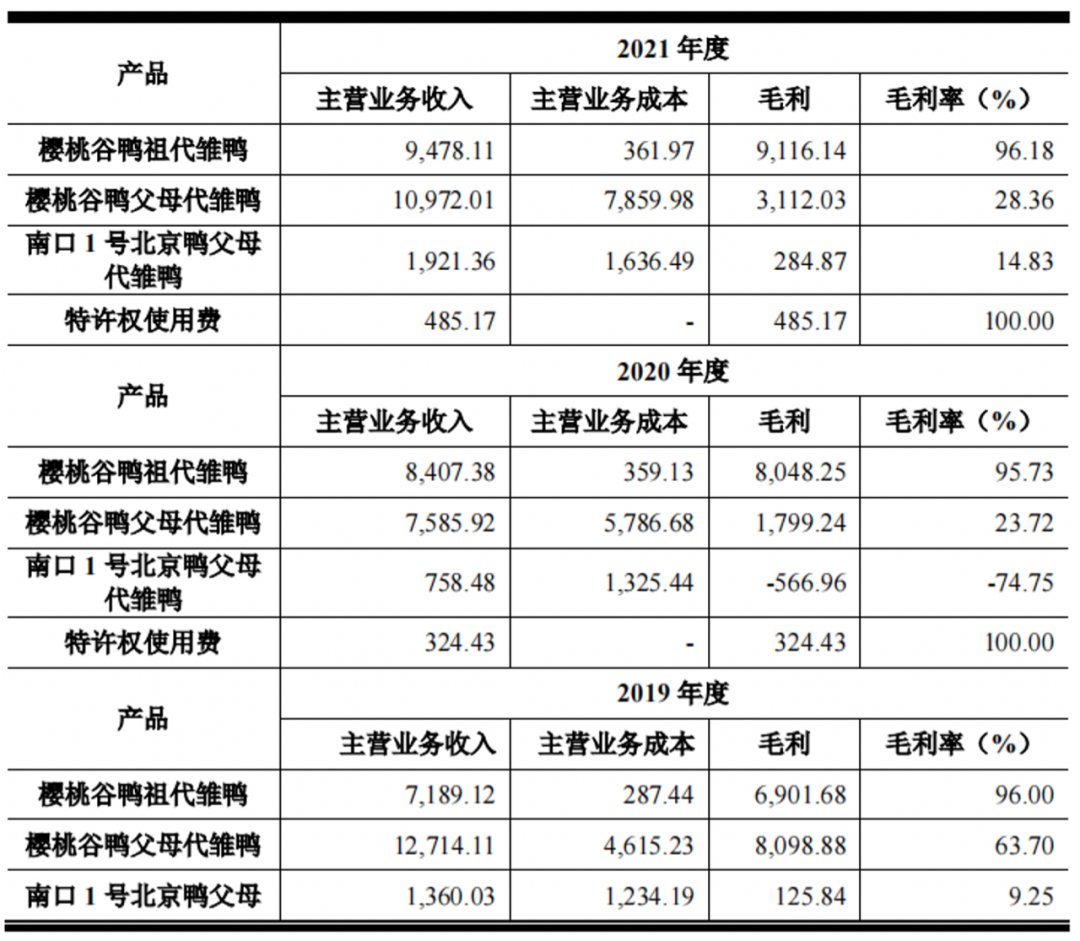 究其原因,主要是由于樱桃谷鸭祖代雏鸭毛利率高。公司的樱桃谷鸭品种基因优势明显,技术门槛较高,价格较高且波动小,该公司为樱桃谷鸭祖代雏鸭的唯一供应商,议价能力较强。报告期内,樱桃谷鸭祖代雏鸭毛利率分别为96.00%、95.73%和96.18%,始终保持较高毛利率。