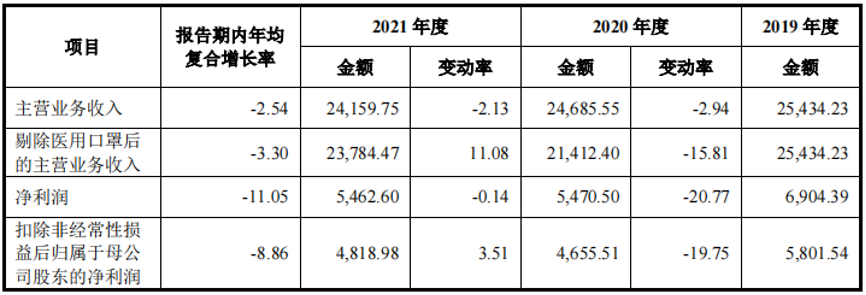 招股书显示,报告期内,该公司主营业务年均复合增长率为-2.54%,剔除医用口罩后的主营业务收入年均复合增长率更低,达到-3.3%。可以看出,该公司很大一部分收入是销售医用口罩所得,其他产品的销售情况更不容乐观。