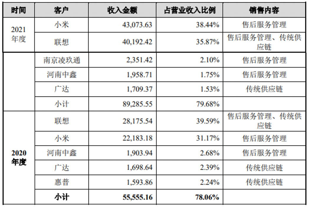 报告期内,迈创股份于前五大客户实现的收入占当期营业收入比例分别为66.89%、78.06%和79.68%,近八成收入源于前五大客户,客户集中度较高。其中,源于前两大客户联想、小米的收入比例也由2019年的55.13%上涨到了2021年的74.31%,体现出迈创股份对核心客户的严重依赖性。