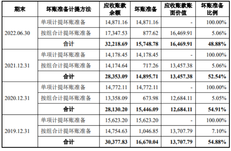 《投资时报》研究员注意到,应收账款计提坏账准备金额占了应收账款余额价值的一半左右,主要系对古巴客户历史累计欠款单项计提的坏账准备。具体来看,健尔康对古巴客户的应收账款,主要由2014年至2017年对古巴客户销售古巴棉和纱布卷形成。2016年,其首次出现信用证违约的情形,并于2017年和2018年大面积违约。截至2018年末,古巴客户相关的应收账款已单项全额计提坏账准备。
