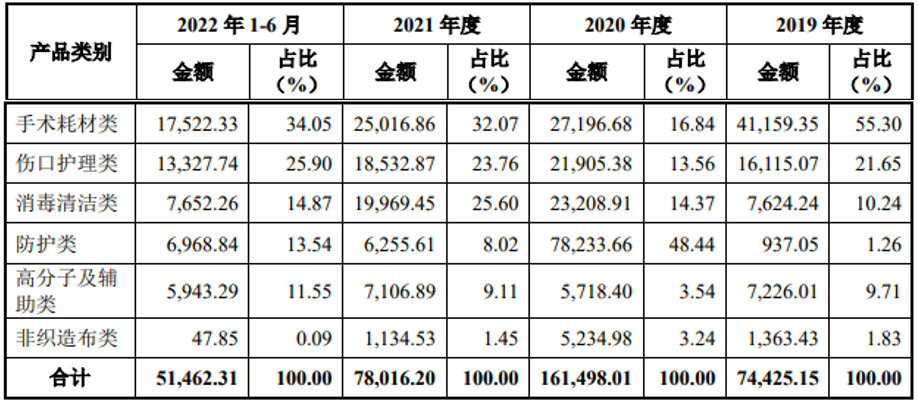 事实上,包含口罩和医用防护服在内的防护类产品销售规模的大幅增长,是该公司业绩大涨的主要原因。进一步来看,口罩销售大涨占主要地位,2022年公司才开始销售防护服产品。报告期内,其防护类产品的营业收入分别为937万元、7.82亿元、6256万元和6969万元,在2020年占总营收比例超五成,甚至超过2019年全年的营收。但此状况终究是没能维持,2021年相关产品销售又迅速回落,但仍超过疫情前营收水平。