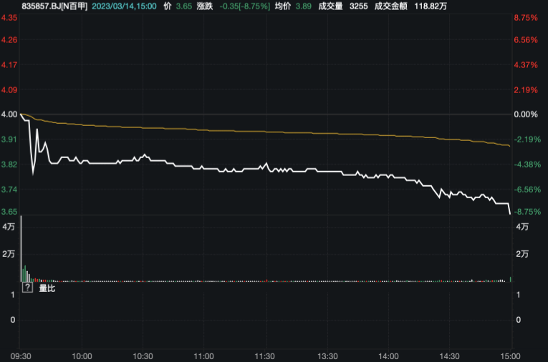 3月14日,百甲科技正式登陆北交所,并于同日在全国中小企业股份转让系统终止挂牌。上市当日,该公司股价总体一路下行,最终收跌8.75%,仅报收于3.65元/股,低于发行价,首日破发。