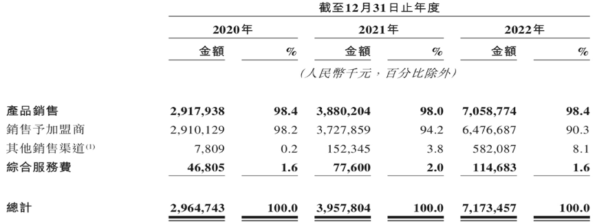 除了资本加持外,与同样来自河南郑州的蜜雪冰城一样,加盟模式才是锅圈食品实现业绩高涨的核心所在。招股书显示,截至2022年末,该公司在全国已建立的9221家门店中,有9216家为加盟店,占比高达99.9%,自营门店仅有5家。报告期内,锅圈食品来自加盟商收入分别为29.1亿元、37.28亿元和64.77亿元,营收占比均达到九成以上,分别为98.2%、94.2%和90.3%。