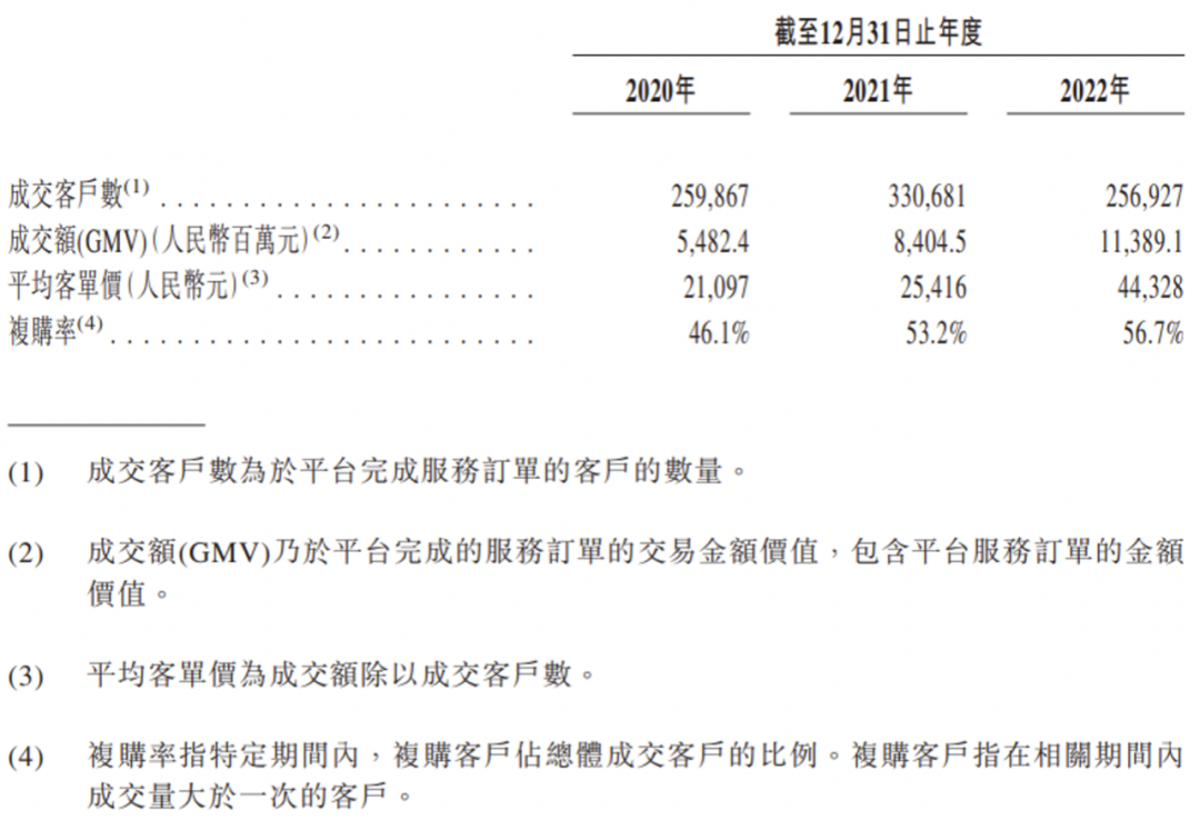 客户情况与营收呈现相同的变化趋势,报告期各期,公司成交客户数分别为25.99万人、33.07万人和25.69万人,2022年为历史新低。好在公司提高了平均客单价,从而维持了成交额(GMV)的增长。
