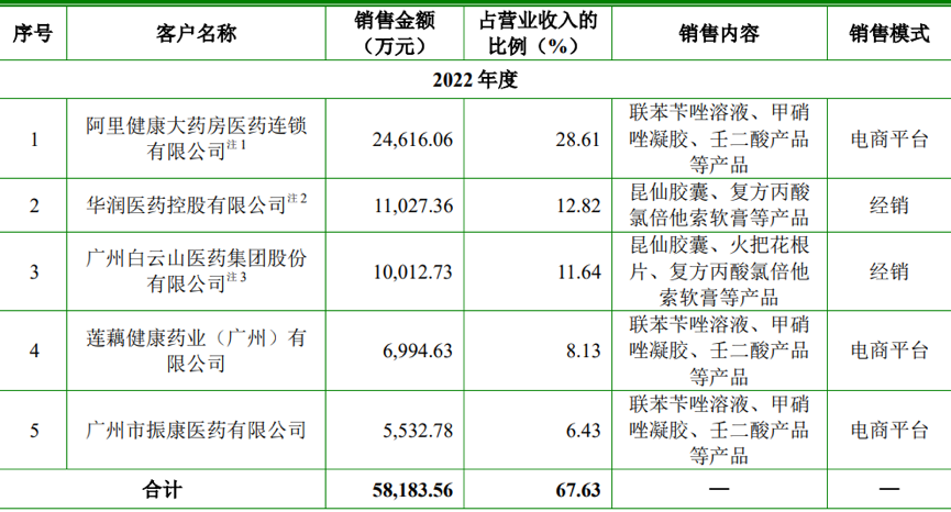 而电商平台的运用也使得知原药业大客户发生变动。2020年,该公司第一大客户为广州白云山医药集团股份有限公司(下称白云山集团),阿里健康大药房为第二大客户。而在2021年和2022年,阿里健康大药房均是知原药业第一大客户,销售占比从2020年的12.60%提升至2022年的28.61%。