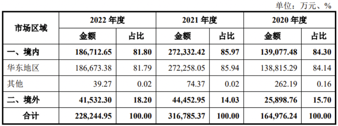 先来看收入地域分布情况。《投资时报》研究员注意到,报告期各期,该公司直接境外销售占主营业务收入比例分别为15.7%、14.03%和18.2%,2022年这一占比不仅没有受国际形势影响,反而出现上升,同比提升超4个百分点。
