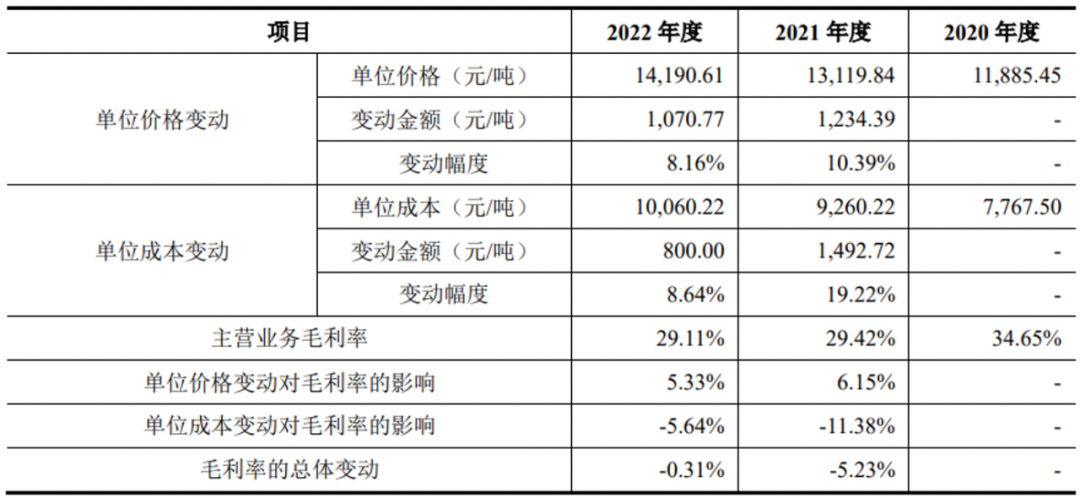 《投资时报》研究员注意到,单位成本上升是公司主营业务毛利率下降的主要因素。金成股份成本主要以钢材为主,钢材价格变动对利润产生较大影响。以毛利率下降5.23%的2021年为例,可以发现,公司同期单位成本上涨19.22%,而单位价格仅上涨10.39%,反映出当上游产业原材料价格上涨时,该公司成本转嫁能力相对较弱。