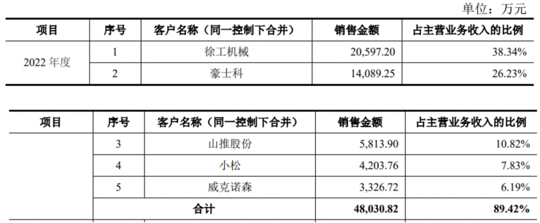 报告期内,金成股份前五大客户几乎未发生变动,主要是徐工机械、豪士科、山推股份和小松,大客户结构较为稳定,前五大客户销售收入合计占同期主营业务收入的比例分别为89.83%、86.09%和89.42%,客户集中度高。
