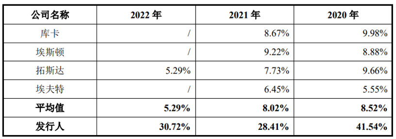这也与节卡股份逐年上升的销售费用关系密切。报告期内,该公司销售费用分别为2005万元、4996万元和8624万元,随着销售规模扩大,销售费用翻了近四倍。同时,同行业可比公司销售费用率均值水平不超过10%,而节卡股份的2022年的销售费用率超过30%。