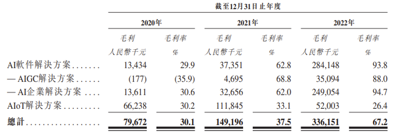 招股书显示,该公司收入分为两大版块,即AI软件解决方案和AIoT解决方案,2022年之前,AIoT解决方案是公司主要收入来源,对公司收入贡献在80%以上。2022年,该部分收入大幅减少,收入贡献也下降至39.4%,相应的,AI软件解决方案营收同比大增408.89%至3.02亿元,成为公司收入的主力。