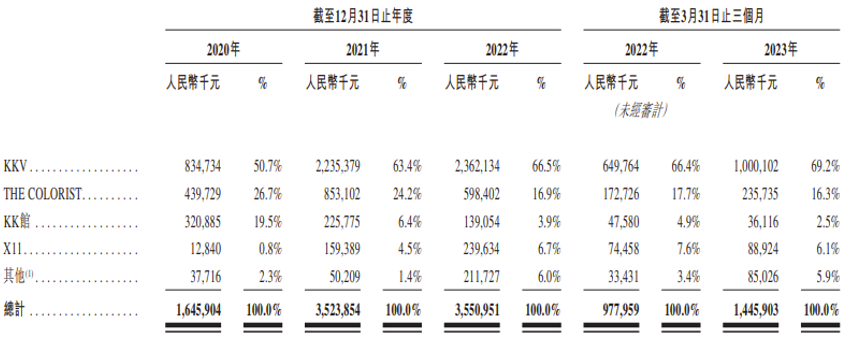 据招股书披露,截至2023年3月31日,KK GROUP旗下门店达690家,包括387家KKV门店、196家THE COLORIST门店、60家KK馆和47家X11门店,KKV门店亦是其主要门店类型。