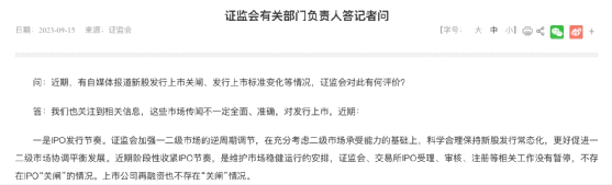 政策一出立即引发市场强烈反响,部分投资者担心未来融资将变得更加困难。9月15日,针对IPO、再融资要暂停等传闻,证监会有关部门负责人在记者会上表示,近期阶段性收紧IPO节奏,是维护市场稳健运行的安排,证监会、交易所IPO受理、审核、注册等相关工作没有暂停,不存在IPO“关闸”的情况和提高上市门槛的情形。目前,沪深北各板块的定位、发行和上市条件、信息披露要求等没有变化。