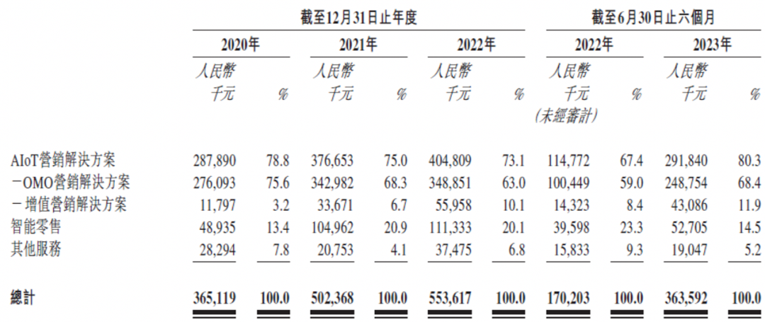 趣致集团主要按项目来向品牌客户收取服务费,2020年、2021年、2022年和2023年1—6月(下称报告期),该条线实现的营收分别为2.76亿元、3.43亿元、3.49亿元和2.49亿元,占同期营业收入的比例为75.6%、68.3%、63%、68.4%,占比将近七成,这是趣致集团AIoT营销解决方案业务的支柱。