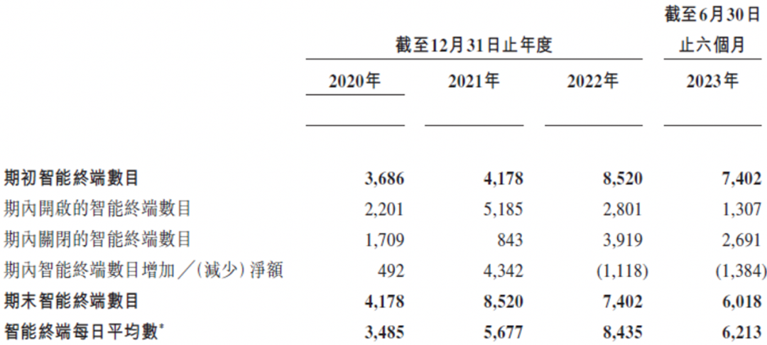 截至报告期各期末,趣致集团智能终端数量分别为4178个、8520个、7402个和6018个;新设的智能终端数量分别为2201个、5185个、2801个和1370个;关闭智能终端数量分别为1709个、843个、3919个、2691个。