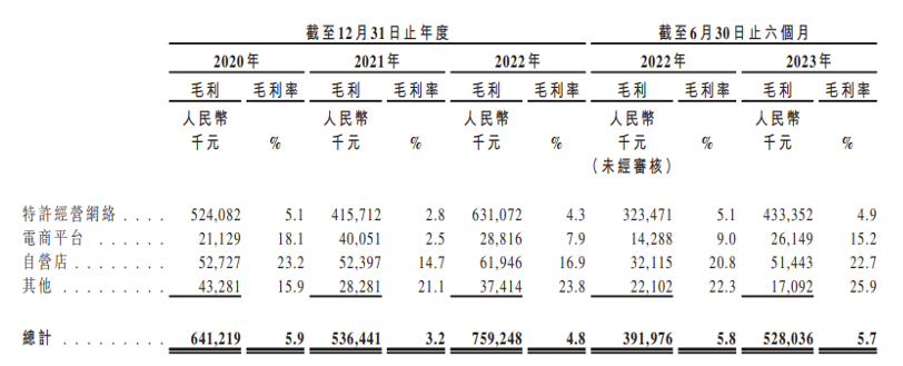 值得关注的是,梦金园在本次招股书中变更了前次A股招股书中披露的“加盟和自营”口径,变成了“特许经营网络”,该分类又下分“加盟商”和“省级代理”两类渠道。这样仅看加盟商渠道收入贡献率就只有60%左右。