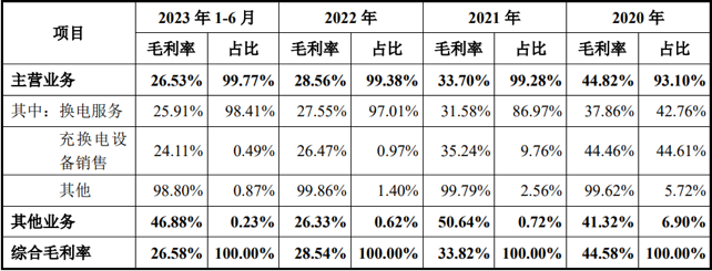 不过,毛利率下滑也并未阻挡宇谷科技业务向换电服务倾斜,该项业务在公司营收中的占比由2020年的42.76%增至2023年上半年的98.41%,充换电设备销售收入占比则由44.61%大幅降至0.49%。若作为业务“大头”的换电服务未来毛利率持续下滑,将对公司经营业绩带来不利影响。