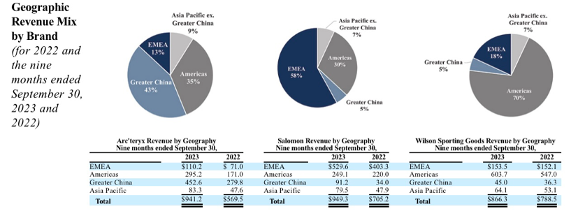 2022年及2023年前三季度,亚玛芬体育三大核心品牌收入及各区域占比情况(百万美元)