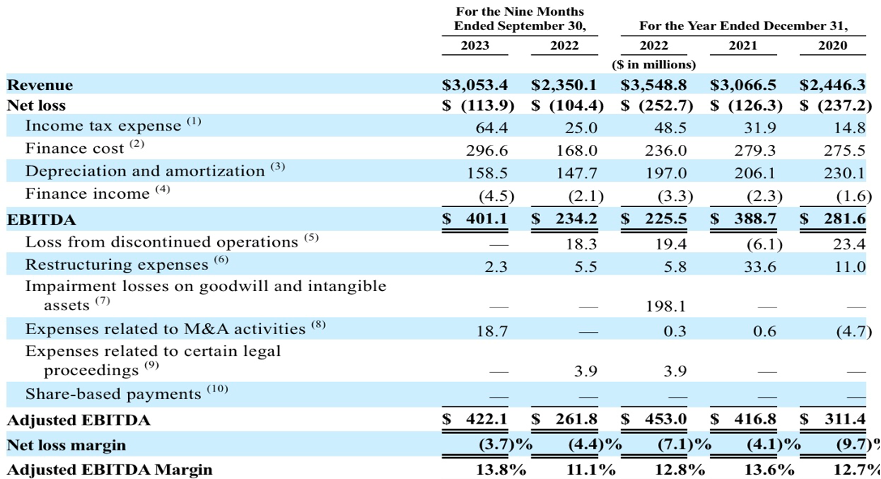 盈利方面,亚玛芬体育则一直处于亏损状态。2020年至2022年,该公司净亏损分别为2.37亿美元、1.26亿美元和2.53亿美元,调整后EBITDA分别为3.11亿美元、4.17亿美元和4.53亿美元,年复合增长率为20.6%。2023年前三季度,该公司录得净亏损为1.14亿美元,仍未实现盈利,调整后EBITDA从2022年同期的2.62亿美元增加61.3%,至4.22亿美元。