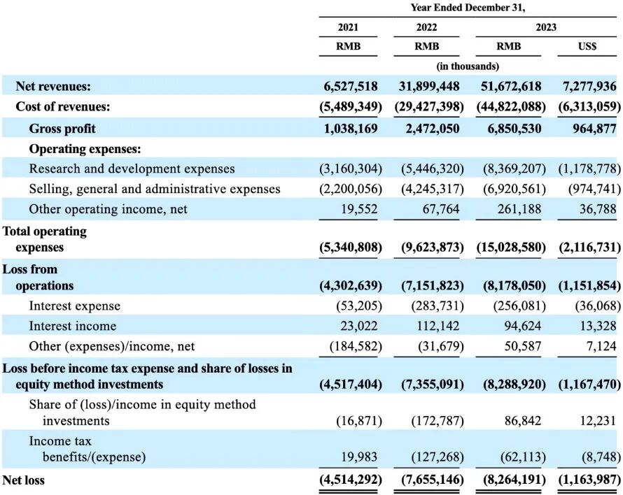 从业绩方面来看,据招股书数据披露,2021年至2023年(下称报告期)极氪增收不增利,净收入从65.28亿元一路增至318.99亿元、516.73亿元,而同时期公司净亏损却持续扩大,分别净亏45.14亿元、76.55亿元和82.64亿元。短短三年时间,公司累计净亏超200亿元,达到204.34亿元。