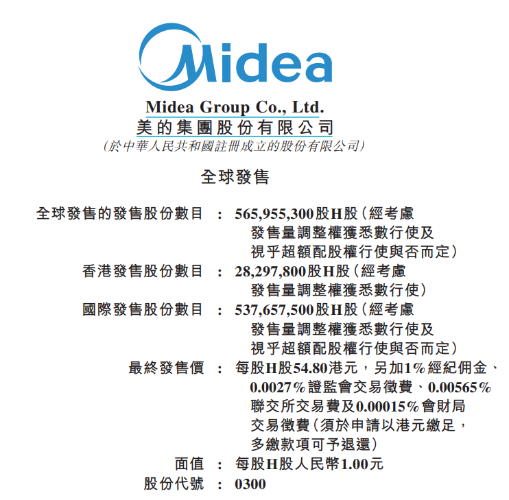 公告显示,美的集团此次发行定价为54.80港元/股,全球共发行5.66亿股,其中香港发行0.28亿股(约占5%),国际发行5.38亿股(约占95%),实际募资约310.14亿港元,募资净额约为306.68亿港元,是自2021年2月快手上市以来香港最大募资规模的IPO,也是全球今年以来第二大规模的新股。