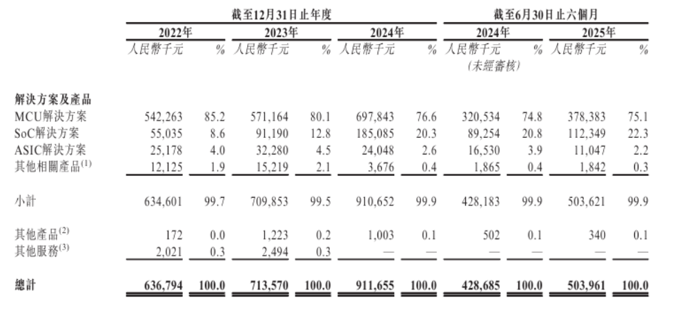 就收入结构而言,MCU解决方案仍是中微半导的主要收入来源,报告期内收入分别为5.42亿元、5.71亿元、6.98亿元及3.78亿元,占比虽从85%以上逐步下降,但仍维持在75%以上。与此同时,SoC解决方案正成为新的增长引擎,收入从5503.5万元增至1.12亿元,占比由8.6%提升至22.3%。