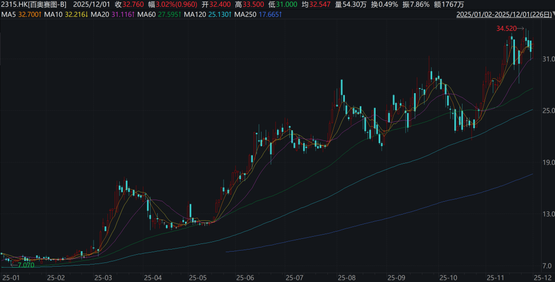 二级市场方面,百奥赛图-B股价从今年年初的7港元/股(不复权,下同)左右持续震荡上行,并在11月18日触及年内高点34.0港元/股。截至12月1日午盘,百奥赛图-B报33港元/股,总市值为131亿港元。