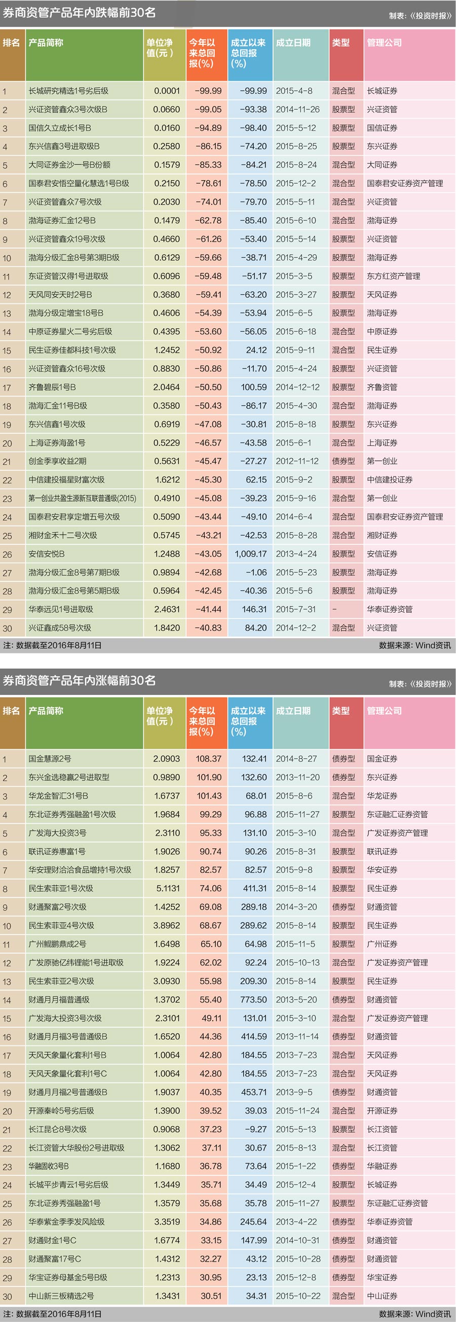 剔除年内成立以及下半年以来没有披露净值的产品后,在3253只进入统计的券商资管产品中(分级产品分开统计),有985只在今年以来录得负收益,长城研究精选1号劣后级、兴证资管鑫众3号次级B等18只产品亏损幅度超过五成。而在取得正收益的产品中,收益涨幅超过五成的有14只,其中国金慧源2号、东兴金选稳赢2号进取型、华龙金智汇31号B业绩翻倍。从券商或资管公司的角度来看,民生证券平均回报率最高,而大同证券表现最差。