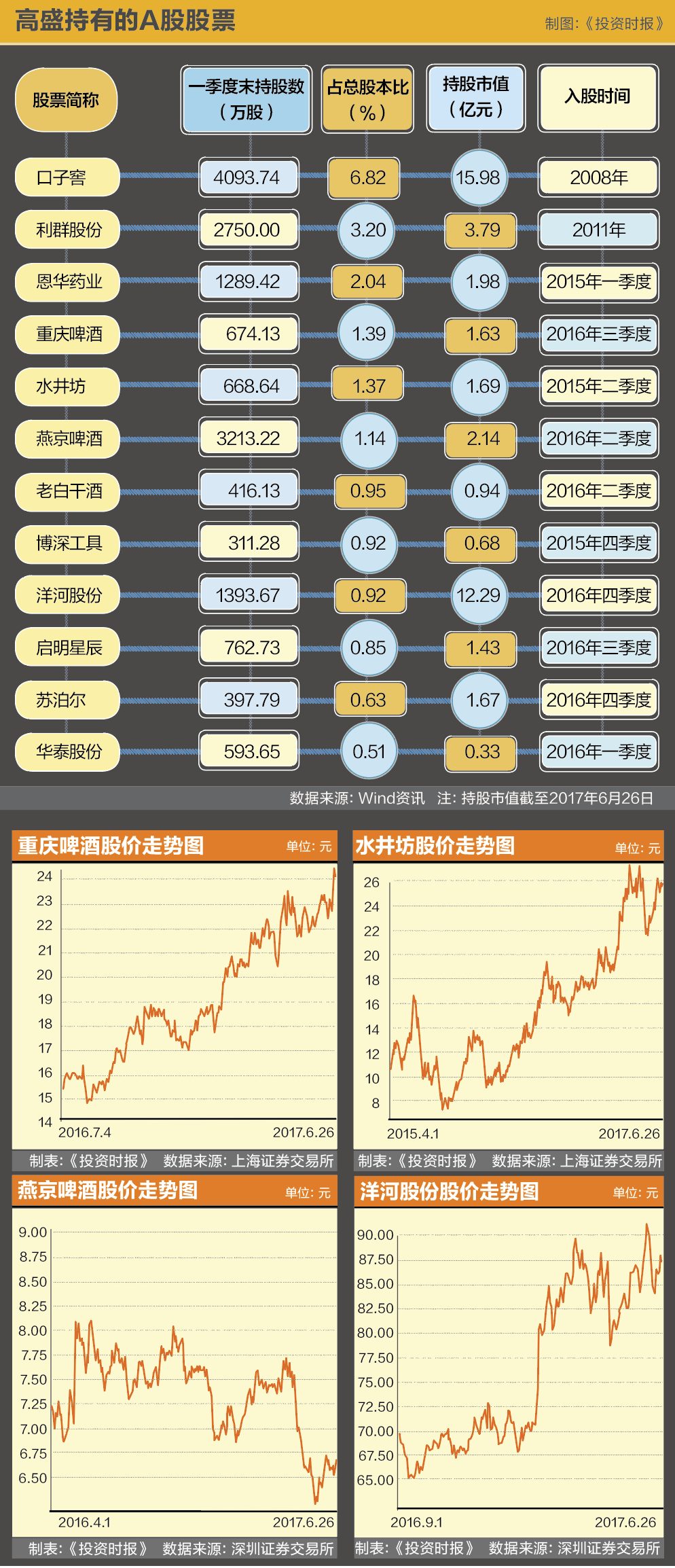最多时占据25.27%股份成为单一最大股东的口子窖,则是高盛投下的最大注。