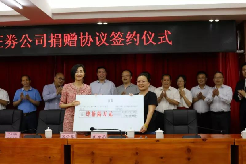 签约仪式上,中天国富证券与台江县人民政府签订了“一司一县”对口帮扶协议;与台江县国有资产经营投资有限公司签订了“一县一企”对口帮扶协议;与台江县民政局签订了公益捐赠协议,根据此协议,中天国富证券将捐资46万元人民币,帮助台江县养老福利院添置必备的消防器材。