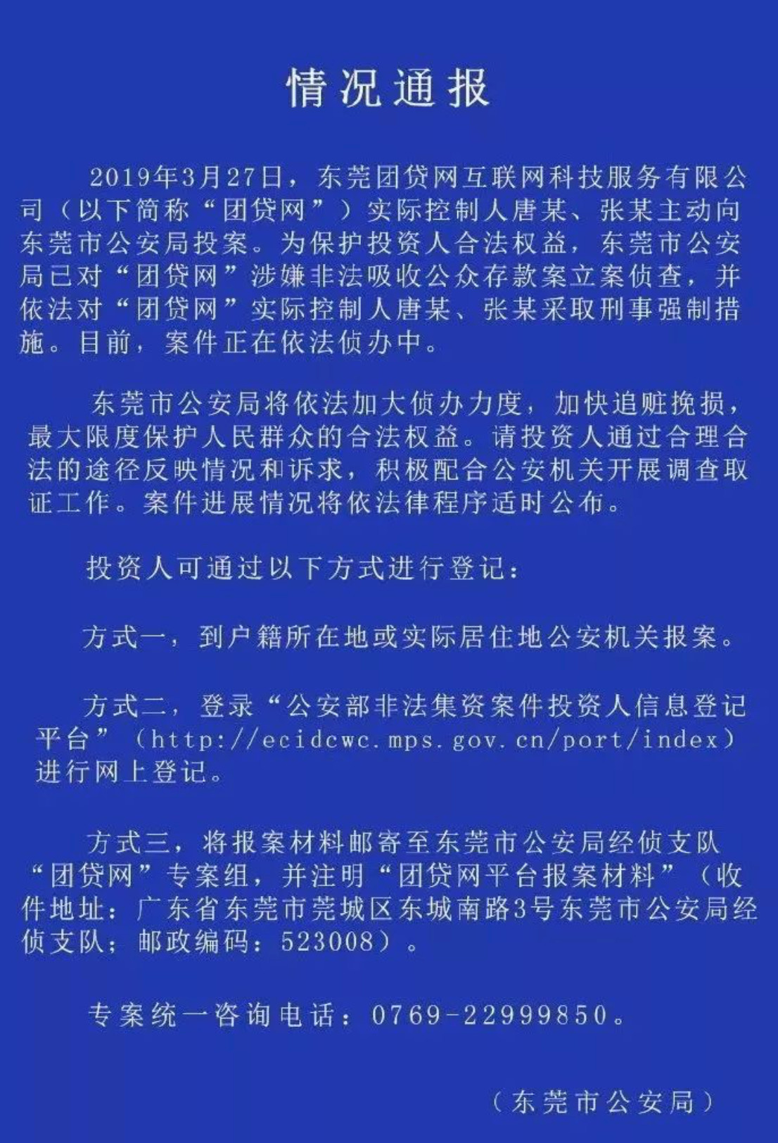 3月28日,东莞市公安局发布情况通报称,3月27日,东莞团贷网互联网科技服务有限公司(下称团贷网)实际控制人唐某、张某主动向东莞市公安局投案。东莞市公安局已对“团贷网”涉嫌非法吸收公众存款案立案侦查,并依法对团贷网实际控制人唐某、张某采取刑事强制措施。目前,案件正在依法侦办中。