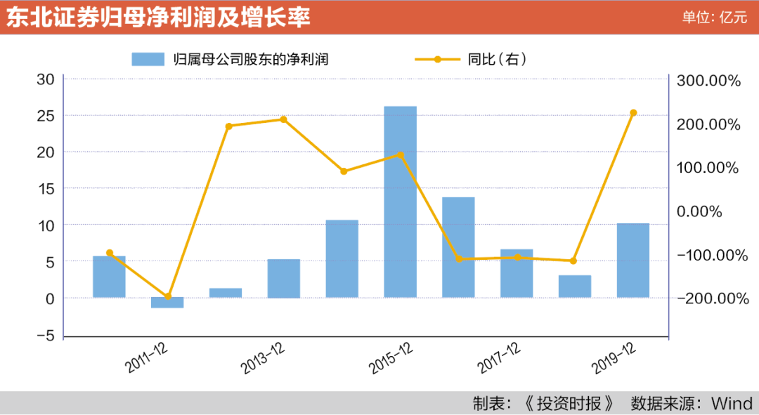 37家A股上市券商年报已经全部出炉,《投资时报》对其业绩情况进行详细梳理,并推出《2019年A股券商赚钱榜》。结果显示,有15家券商2019年归母净利润翻倍,占比达到四成。其中,东北证券股份有限公司(下称东北证券,000686.SZ)当年实现归母净利润10.07亿元,同比增长234.19%,这一增长率在37家券商中排名第7。
