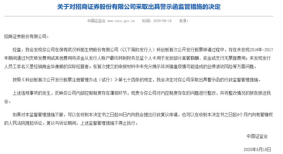今年8月18日,证监会发布《关于对招商证券股份有限公司采取出具警示函监管措施的决定》,经查,该会发现招商证券在保荐科前生物科创板首次公开发行股票申请过程中,存在未发现2016年—2017年期间通过列支研发费用或其他费用将资金从科前生物账户最终转到财务总监个人卡用于发放部分高管薪酬、奖金或支付无票据费用;未发现科前生物员工李名义是经销商金华康顺的实际经营者;在首次提交的申报材料中未充分揭示非洲猪瘟疫情可能造成的业绩波动风险等方面问题。按照相关规定,证监会决定对招商证券采取出具警示函的行政监督管理措施。