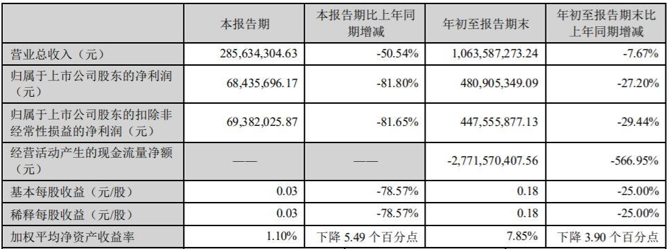 第三季度,该公司营业总收入为2.86亿元,同比降50.54%;归属于上市公司股东的净利润为0.68亿元,同比大降81.80%。