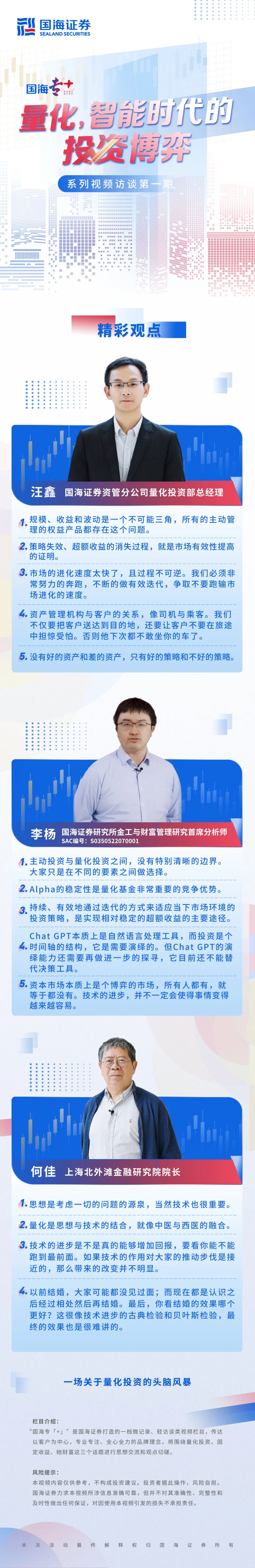 近日,国海证券推出了“国海专「+」”系列对话,国海证券资管量化投资部总经理汪鑫与国海证券金融工程与财富管理研究首席分析师李杨、上海北外滩金融研究院院长何佳一起进行思想对谈,探寻量化投资的进化要素。
