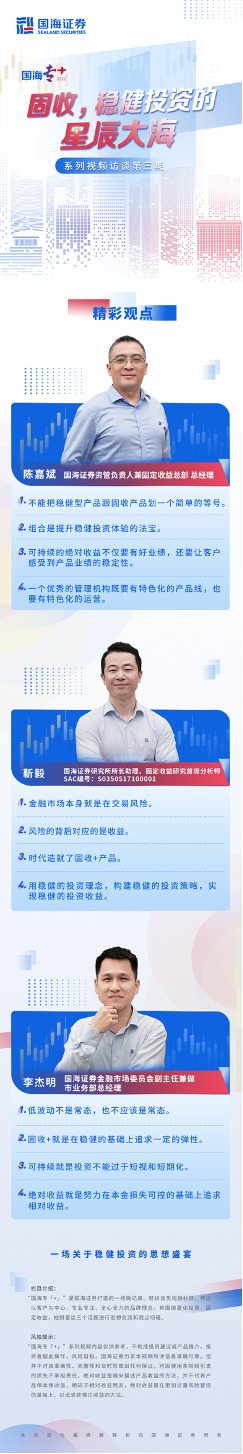 在资管行业净值化转型的大背景下,固收产品投资要如何拥抱市场,踏上进阶之路?资产管理机构又该如何抓住固收产品的发展机遇,实现差异化发展?国海专「+」第三期邀请了国海证券资管负责人陈嘉斌、国海证券金融市场委员会副主任李杰明、国海证券研究所固定收益研究首席分析师靳毅三位行业老将,围绕固定收益投资的系列话题展开深入对话,详解国海证券固收业务发展背后的思考与实践,一起探寻稳健投资的星辰大海。