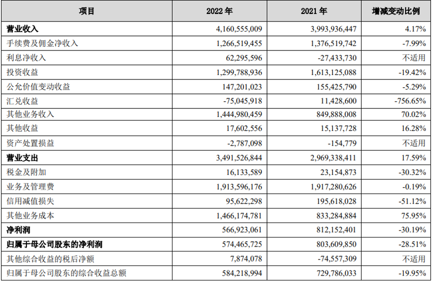 2022年,受国内资本市场低迷影响,券商整体业绩承压。山西证券经营业绩表现并不理想,营业总收入同比增长4.17%,但归母净利润同比下滑接近三成,降幅高于行业。