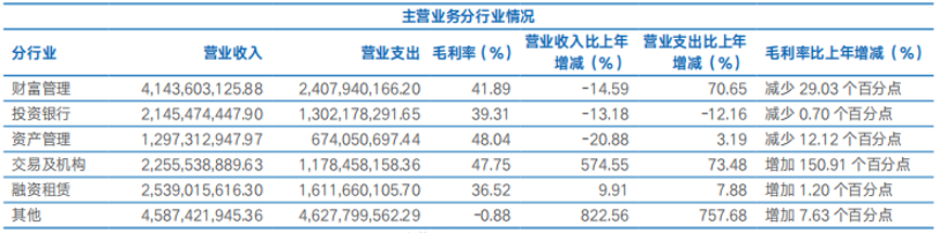 具体来看,今年上半年,海通证券财富管理业务实现营业收入41.44亿元,与去年同期的48.52亿元相比减少了7.08亿元,减幅为14.59%;投资银行业务实现营业收入21.45亿元,与去年同期的24.71亿元相比减少了3.26亿元,减幅为13.18%;资产管理业务实现营业收入12.97亿元,与去年同期的16.40亿元相比减少了3.43亿元,减幅达20.88%。今年上半年,财富管理、投资银行、资产管理三项业务的毛利率分别为41.89%、39.31%及48.04%,分别同比减少29.03个百分点、0.70个百分点和12.12个百分点。