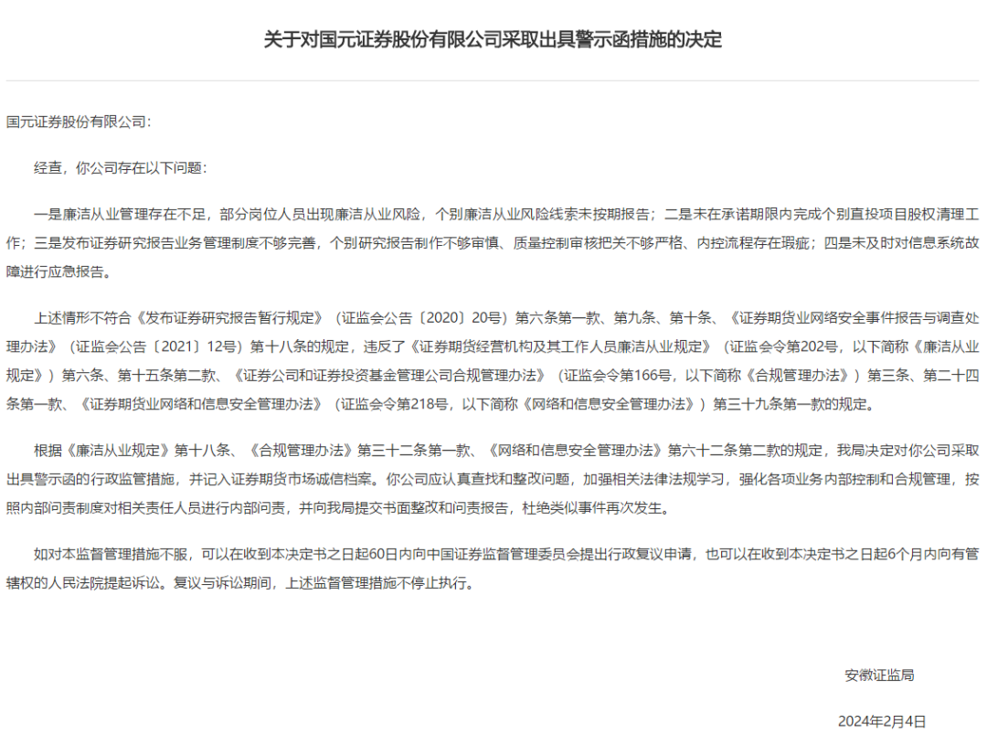 中国证监会官网2024年3月1日发布信息显示,2024年2月4日,安徽证监局决定对国元证券采取出具警示函措施。