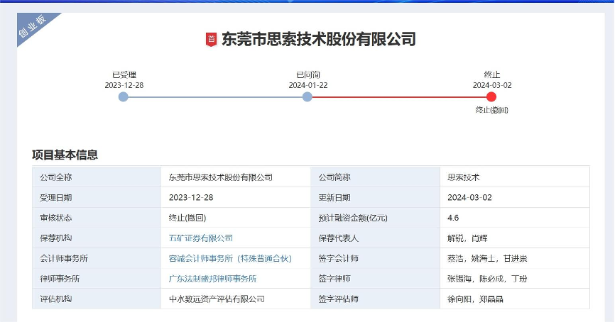 距深交所公布已发出第一轮问询函仅4天,离深交所受理IPO申请也仅29天,五矿证券有限公司(下称五矿证券)保荐的东莞市思索技术股份有限公司(下称思索技术)即撤回了上市申请。