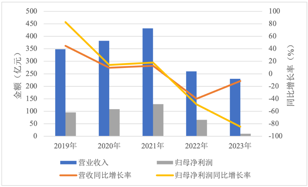 据过往年报披露,2019年—2023年,海通证券营业收入分别为348.60亿元、382.20亿元、432.05亿元、259.48亿元、229.53亿元,同比增长率分别为46.69%、9.64%、13.04%、-39.94%、-11.54%。可以看出,该公司近五年的营业收入存在较大波动,近两年连续负增长。