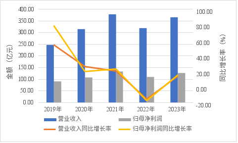 具体来看,2019年—2023年,该公司的营业收入分别为248.63亿元、314.45亿元、379.05亿元、320.32亿元、365.78亿元,同比分别增长54.35%、26.47%、20.55%、-15.50%、14.19%;归母净利润分别为90.02亿元、108.22亿元、133.46亿元、110.53亿元、127.51亿元,同比分别增长78.86%、20.23%、23.32%、-17.18%、15.35%。